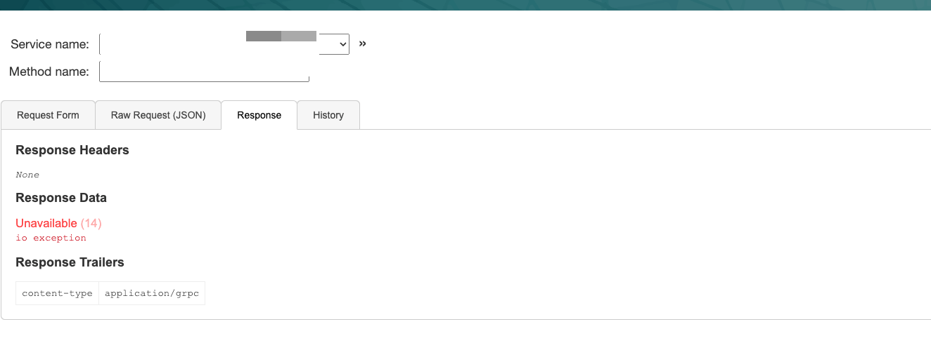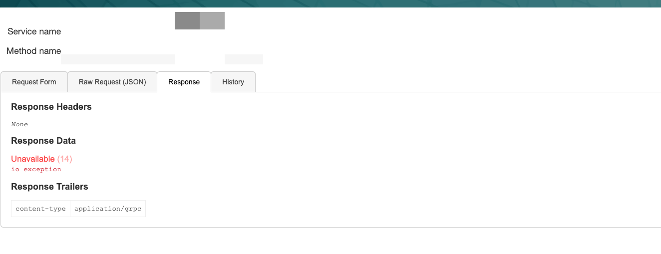 io.grpc.StatusRuntimeException: UNAVAILABLE: io exception at io.grpc.stub.ClientCalls.toStatusRuntimeException(ClientCalls.java:271) ~[grpc-stub-1.46.1.jar:1.46.1] at io.grpc.stub.ClientCalls.getUnchecked(ClientCalls.java:252) ~[grpc-stub-1.46.1.jar:1.46.1] at io.grpc.stub.ClientCalls.blockingUnaryCall(ClientCalls.java:165) ~[grpc-stub-1.46.1.jar:1.46.1] at kr.socar.grpc.apis.accounts.member.v1.MemberServiceGrpc$MemberServiceBlockingStub.getMemberWithDriverLicense(MemberServiceGrpc.java:772) ~[main/:na] at kr.socar.client.AccountsMemberGrpcClient.findByUserId(AccountsMemberGrpcClient.kt:34) ~[main/:na] at kr.socar.dao.MemberGrpcDAO.findByUserId(MemberGrpcDAO.kt:18) ~[main/:na] at kr.socar.dao.MemberGrpcDAO$$FastClassBySpringCGLIB$$8c0d7d21.invoke(<generated>) ~[main/:na]