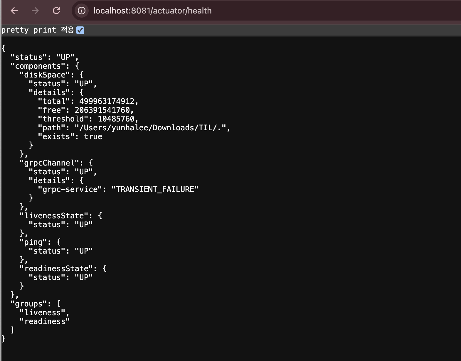 actuator/health 요청 응답으로 받은결과는 다음과 같다.
