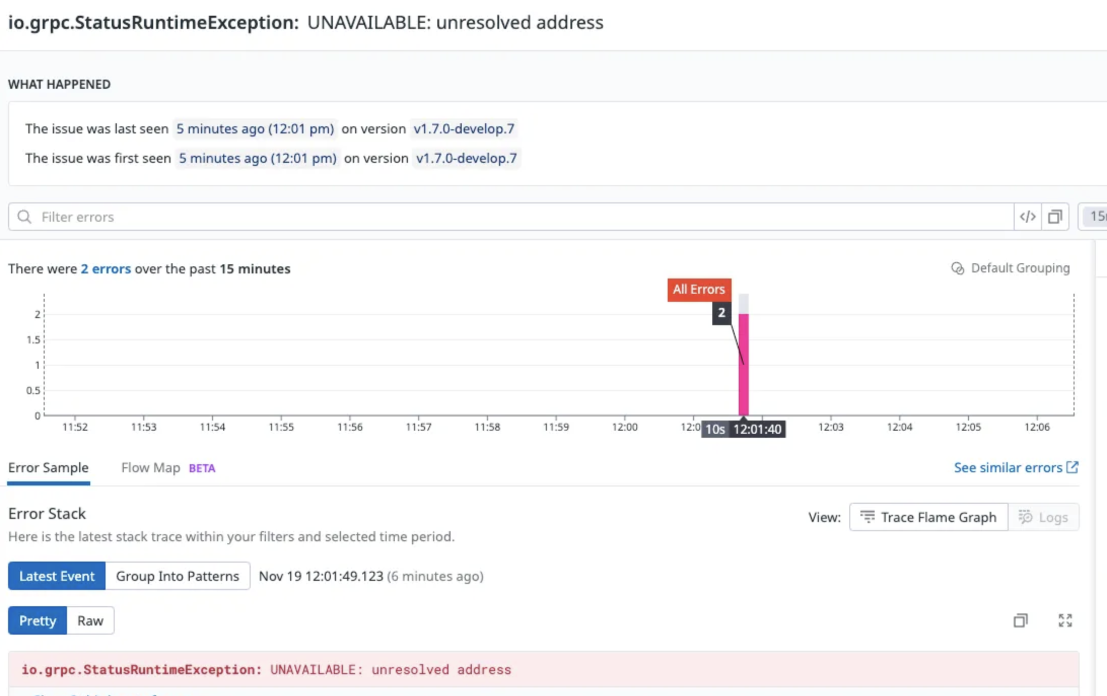 이 상태에서 서비스 연결을 끊고 호출을 하게 되면 다음과 같은 UNAVAILABLE 응답을 받게되고, 연결 상태가 TRANSIENT_FAILURE로 변경되는 것을 확인할 수 있었다.