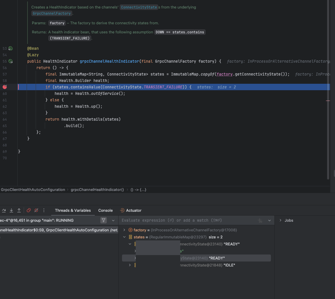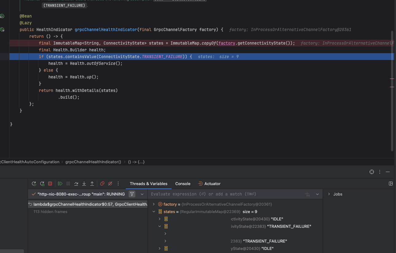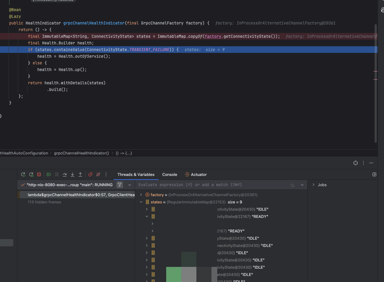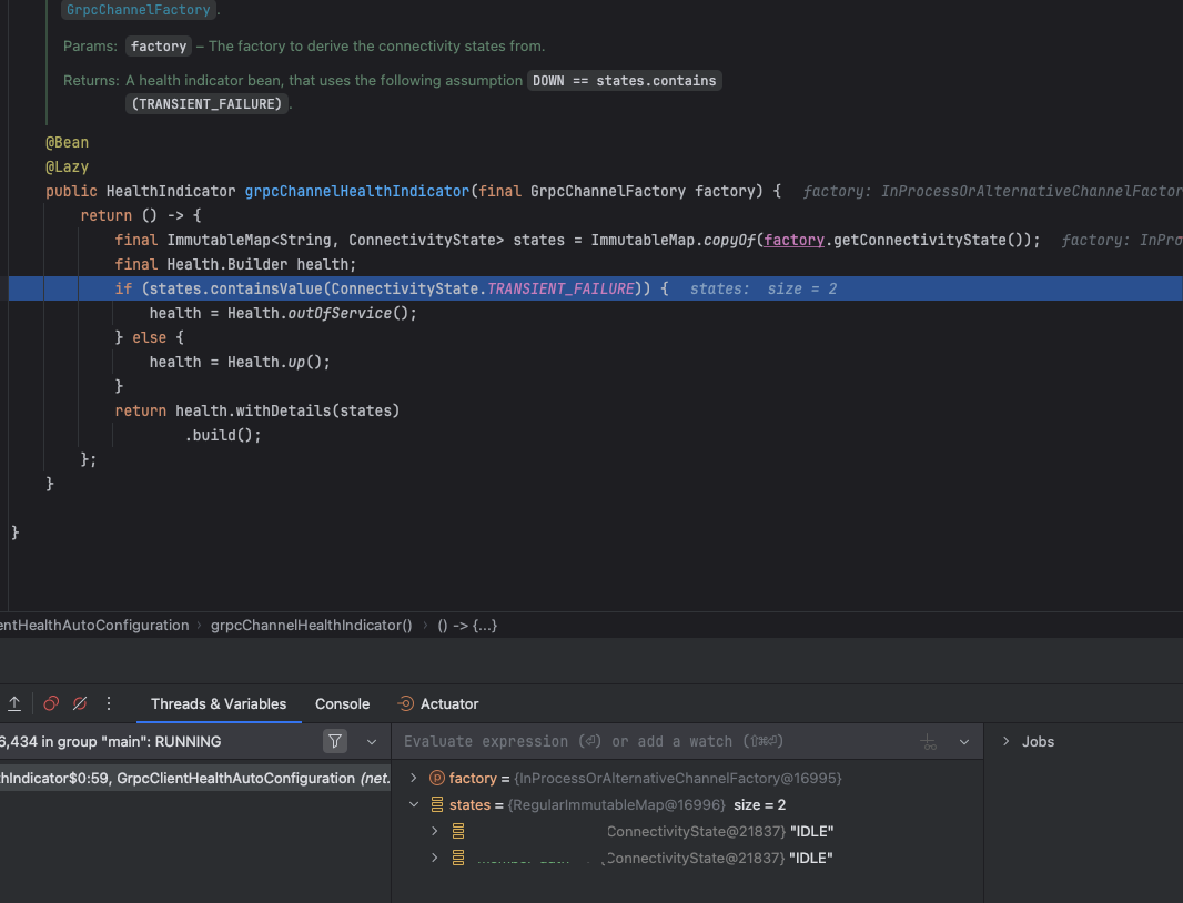 어라...? 요약하자면 해당 서버는 net.devh의 grpc-spring-boot-starter를 사용중이었는데,(https://yidongnan.github.io/grpc-spring-boot-starter) 해당 라이브러리의 GrpcClientHealthAutoConfiguration이 actuator 지표중인 grpcChannel의 지표가 하나라도 TRANSIENT_FAILURE인 상태를 가진다면, 서비스 상태를 OUT_OF_SERVICE 상태로 바꿔버린다 는 것이었다.