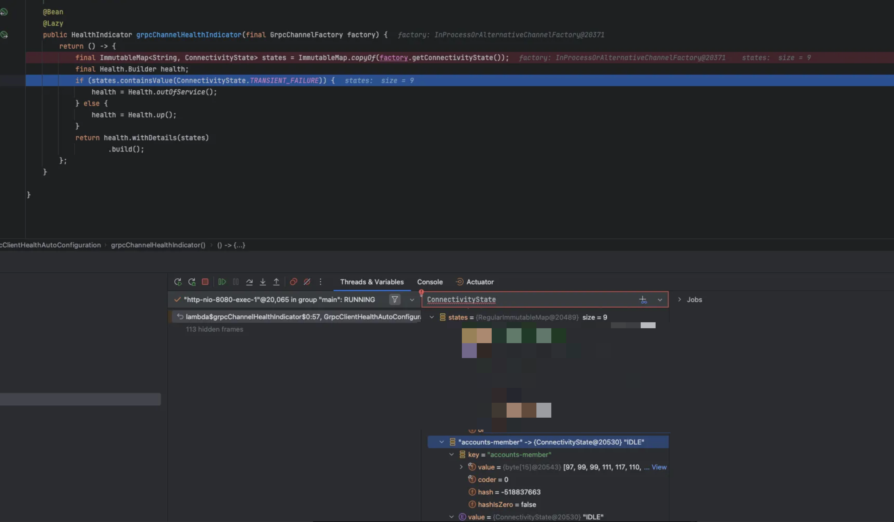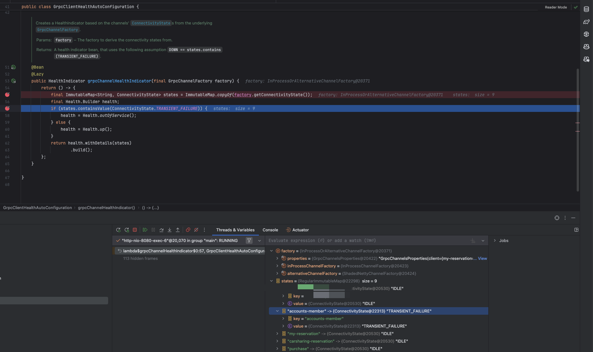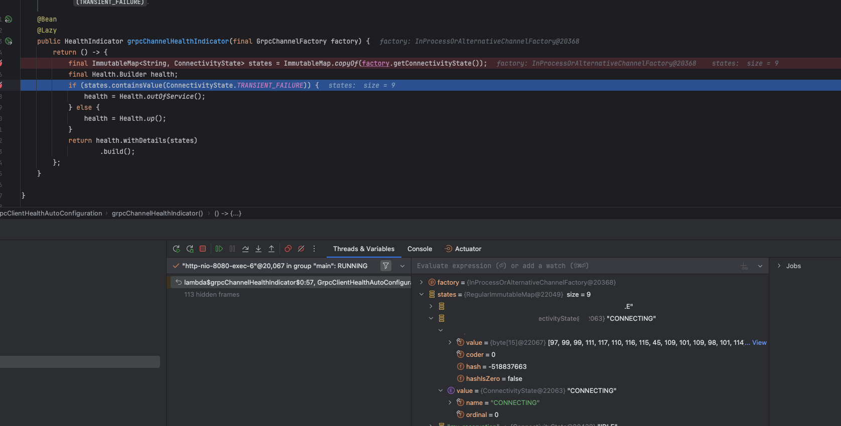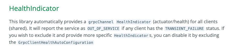 어라...? 요약하자면 해당 서버는 net.devh의 grpc-spring-boot-starter를 사용중이었는데,(https://yidongnan.github.io/grpc-spring-boot-starter) 해당 라이브러리의 GrpcClientHealthAutoConfiguration이 actuator 지표중인 grpcChannel의 지표가 하나라도 TRANSIENT_FAILURE인 상태를 가진다면, 서비스 상태를 OUT_OF_SERVICE 상태로 바꿔버린다 는 것이었다.