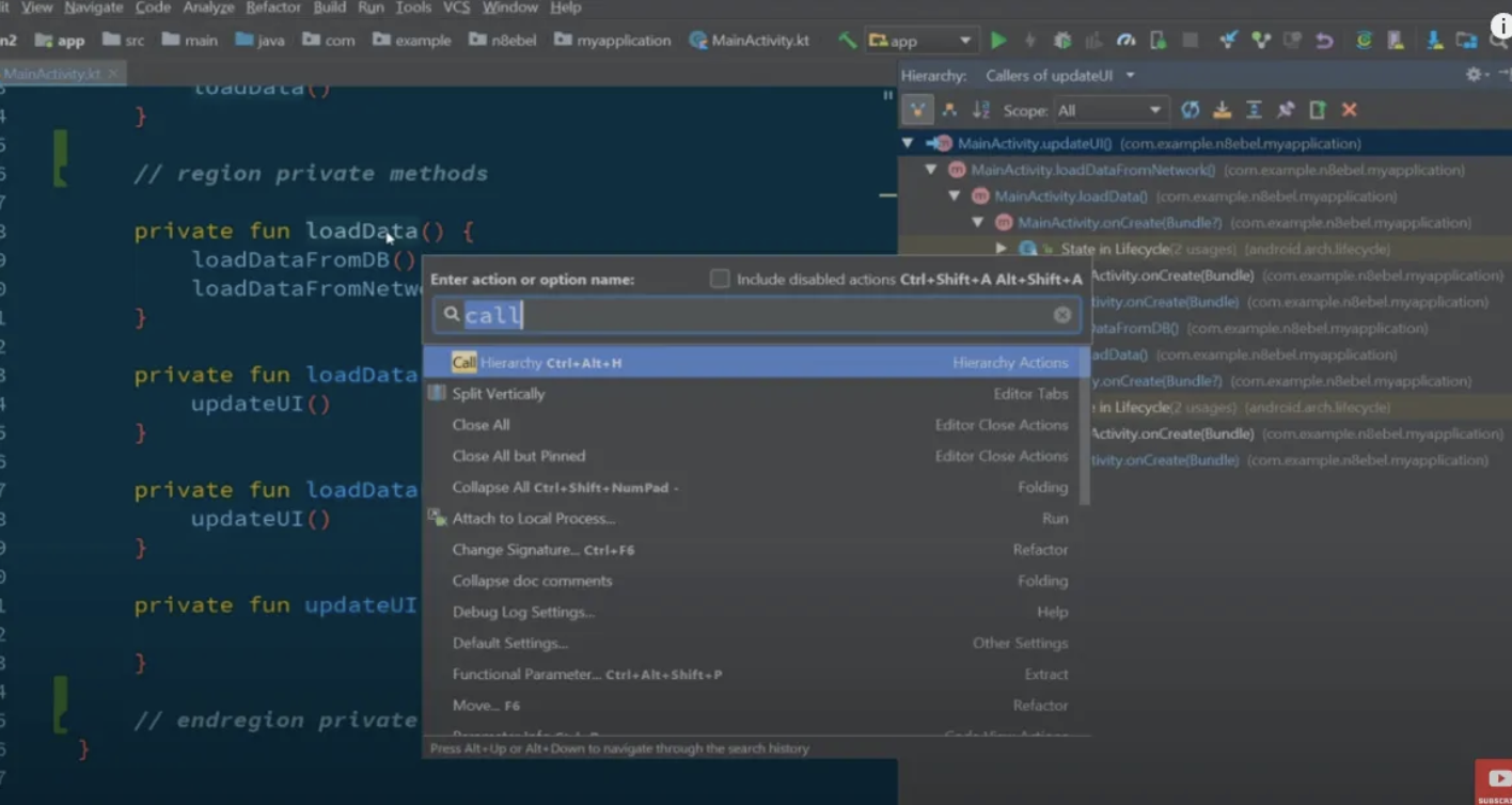 - 특정 함수가 호출된 부분으로 이동하려면 함수 위에서 Ctrl + Shift + A를 눌러 Find Usages를 검색하거나 바로 Alt + F7 (Mac에서는 Option + F7)을 눌러 호출된 모든 위치를 찾을 수 있습니다.